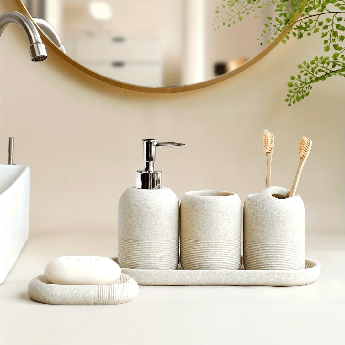 Set de Baño 5 Piezas: Dispensador, Vaso, Portacepillos, Jabonera, Bandeja