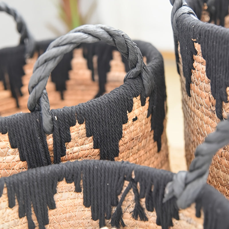 Cesta de Almacenaje Tejida a Mano con Asas Negras y Borlas Blancas