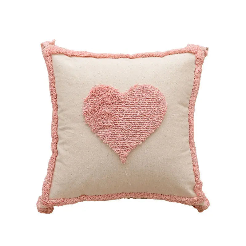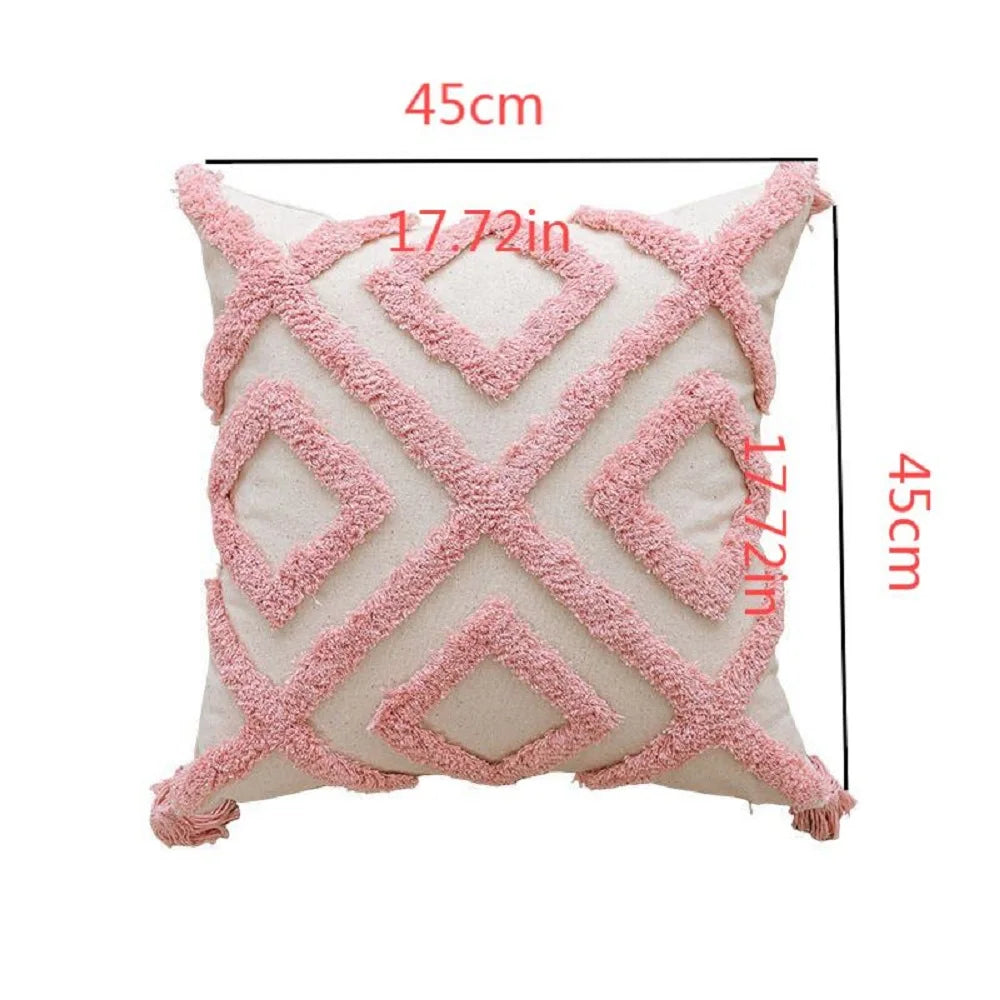 Funda de cojín decorativa en tono rosa con capitoné y borlas, perfecta para añadir un toque boho chic a cualquier ambiente. Su textura suave y su diseño bordado aportan calidez y estilo tanto en sofás como en camas o sillones.
