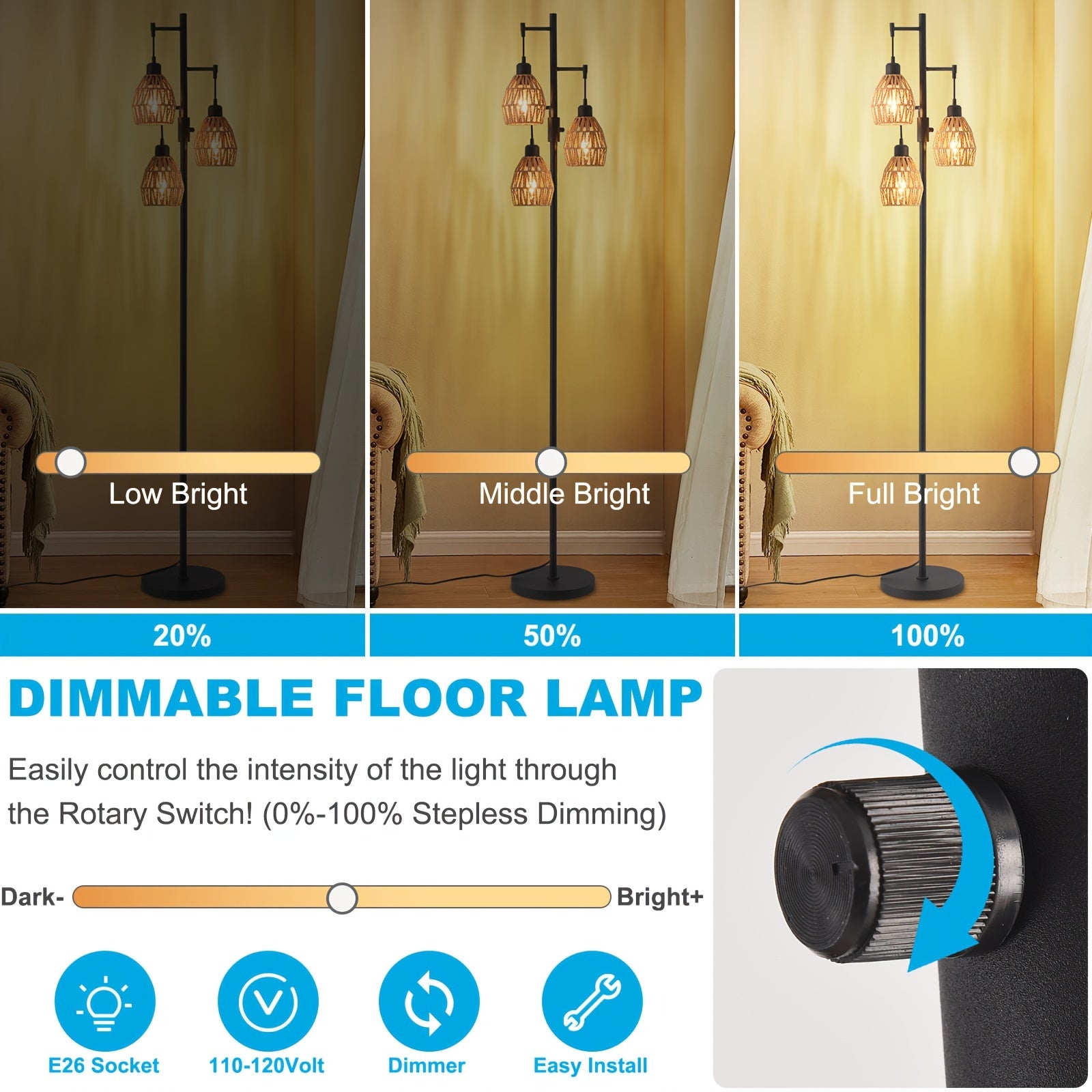 Lámpara de Pie Boho Rattan con Regulador de Intensidad